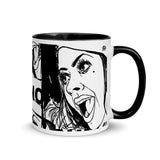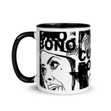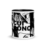 Monochrome Mug with black rim, handle and inside and Cui bono print